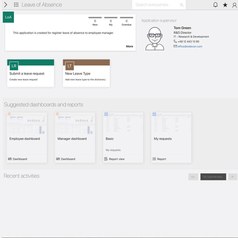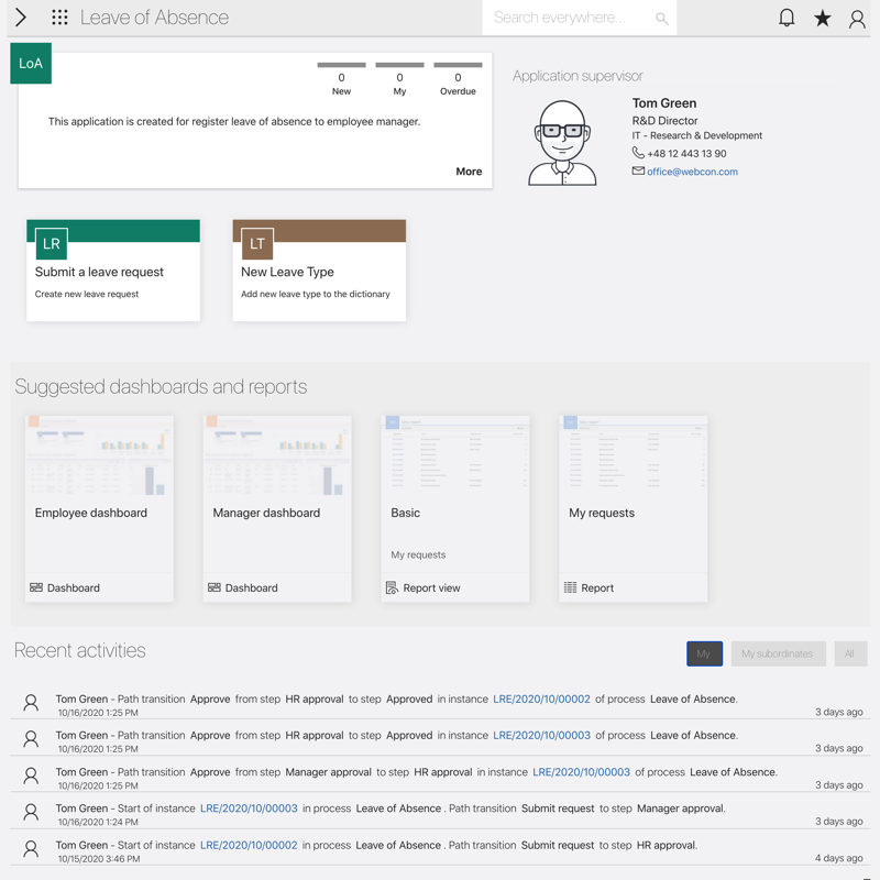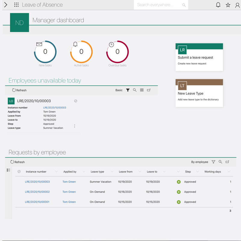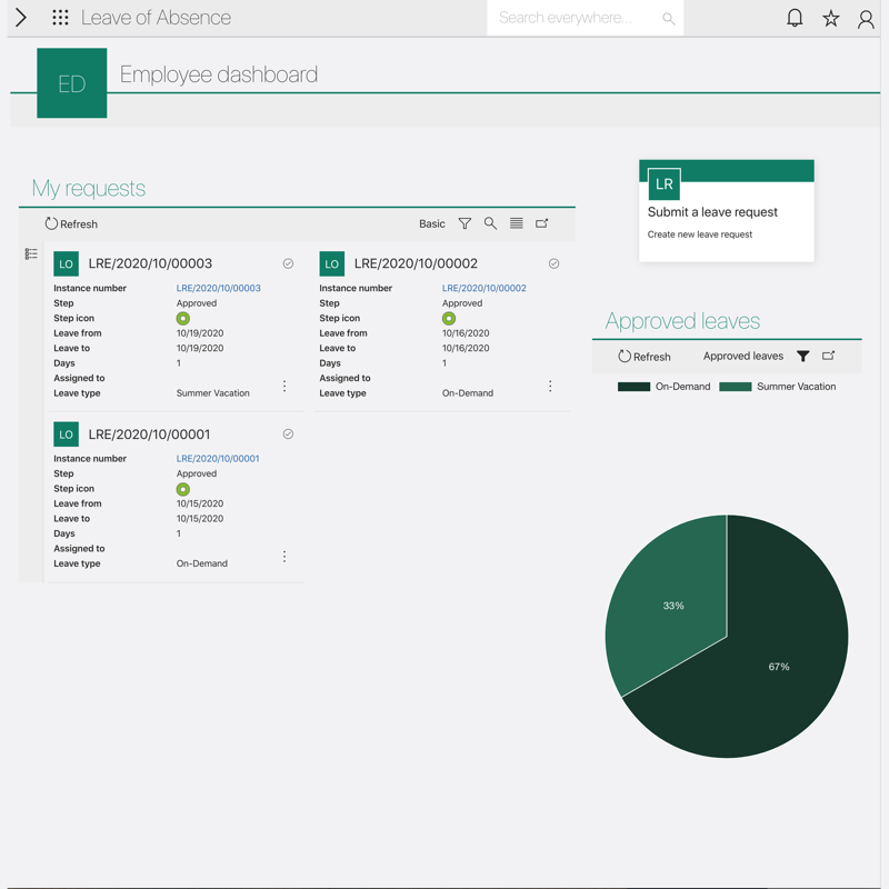 • Leave request – which contains the main workflow: Leave request – used to submit leave of absence requests or to report an absence from work.