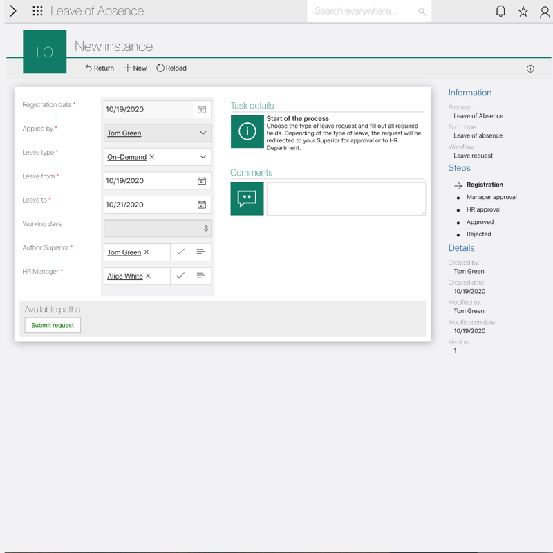 • Employee – a person who submits a leave of absence request for approval. If the request is submitted for the first time, an employee must specify the superior and a person from the HR department who can approve the request [HR manager].
