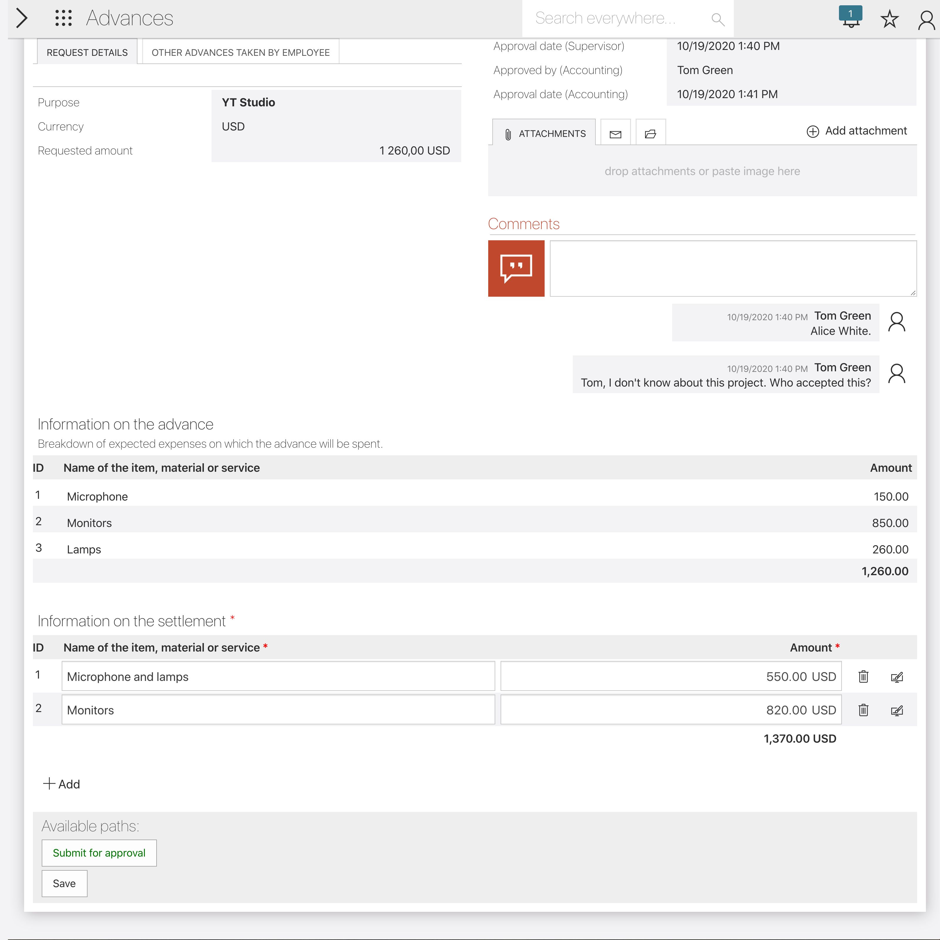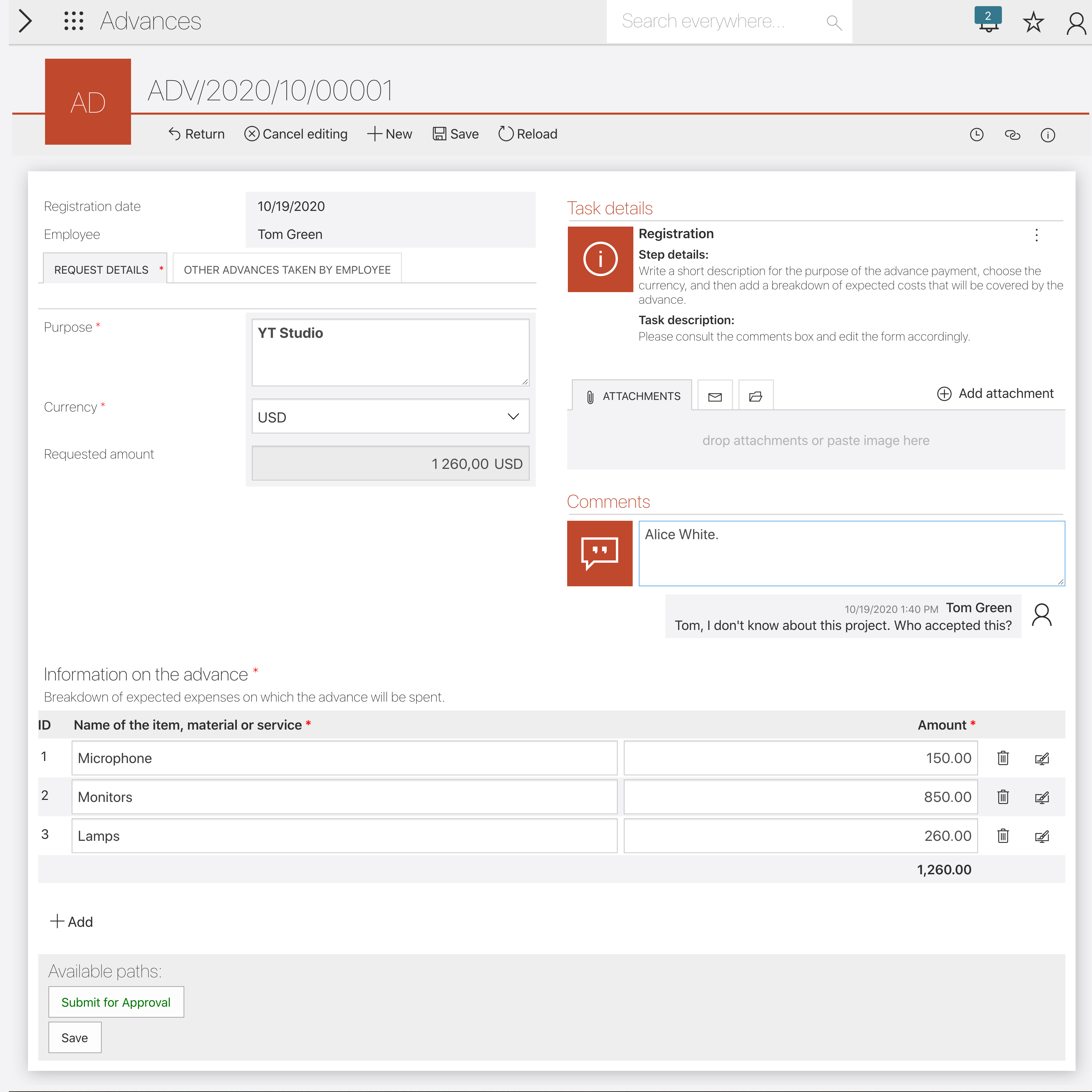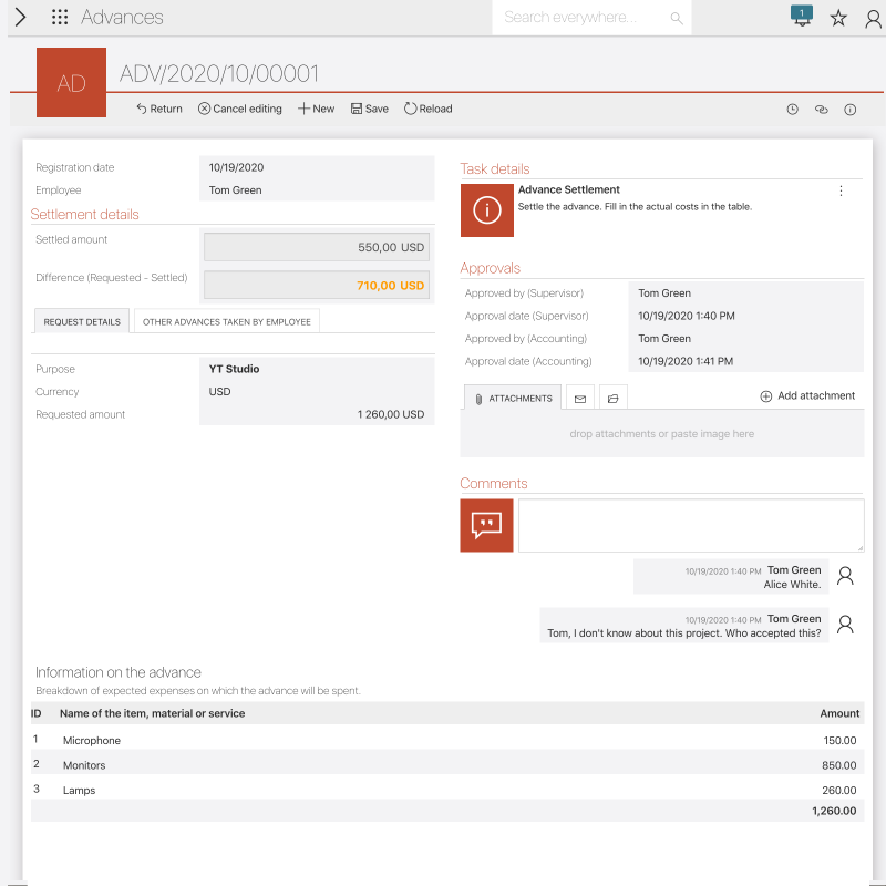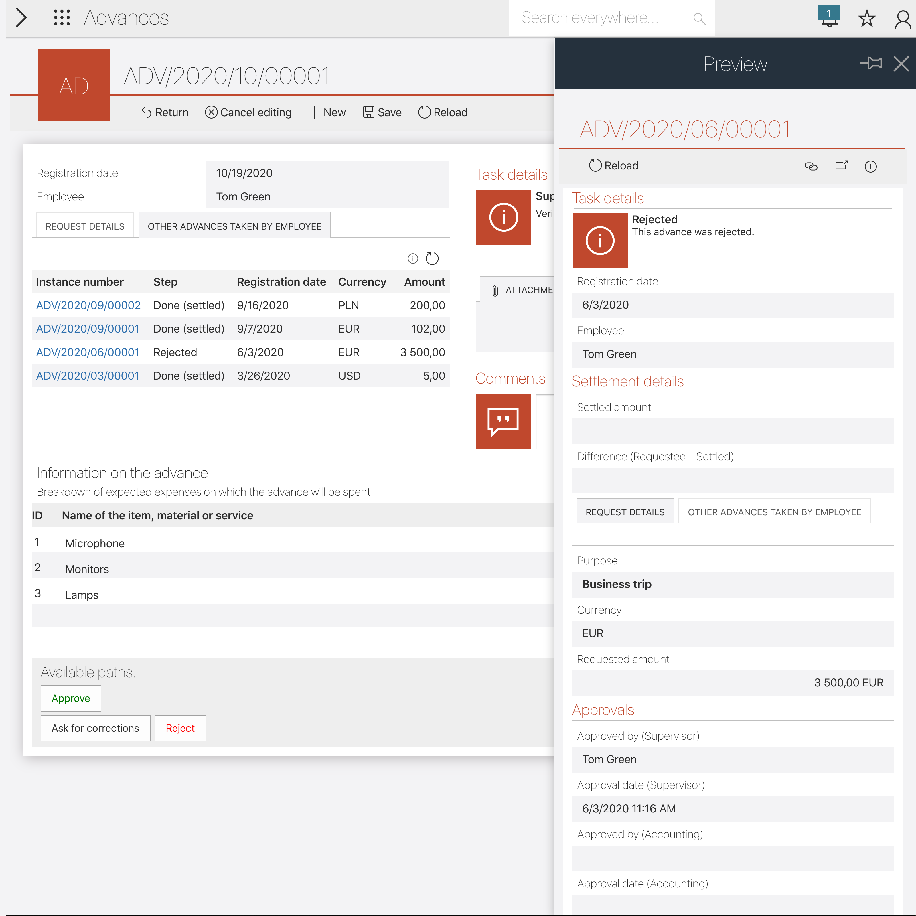 Employee – registers a request for an advance payment, and lists the expected expenses. Later on, they enter info about the actual costs they incurred [Settlement of the advance].