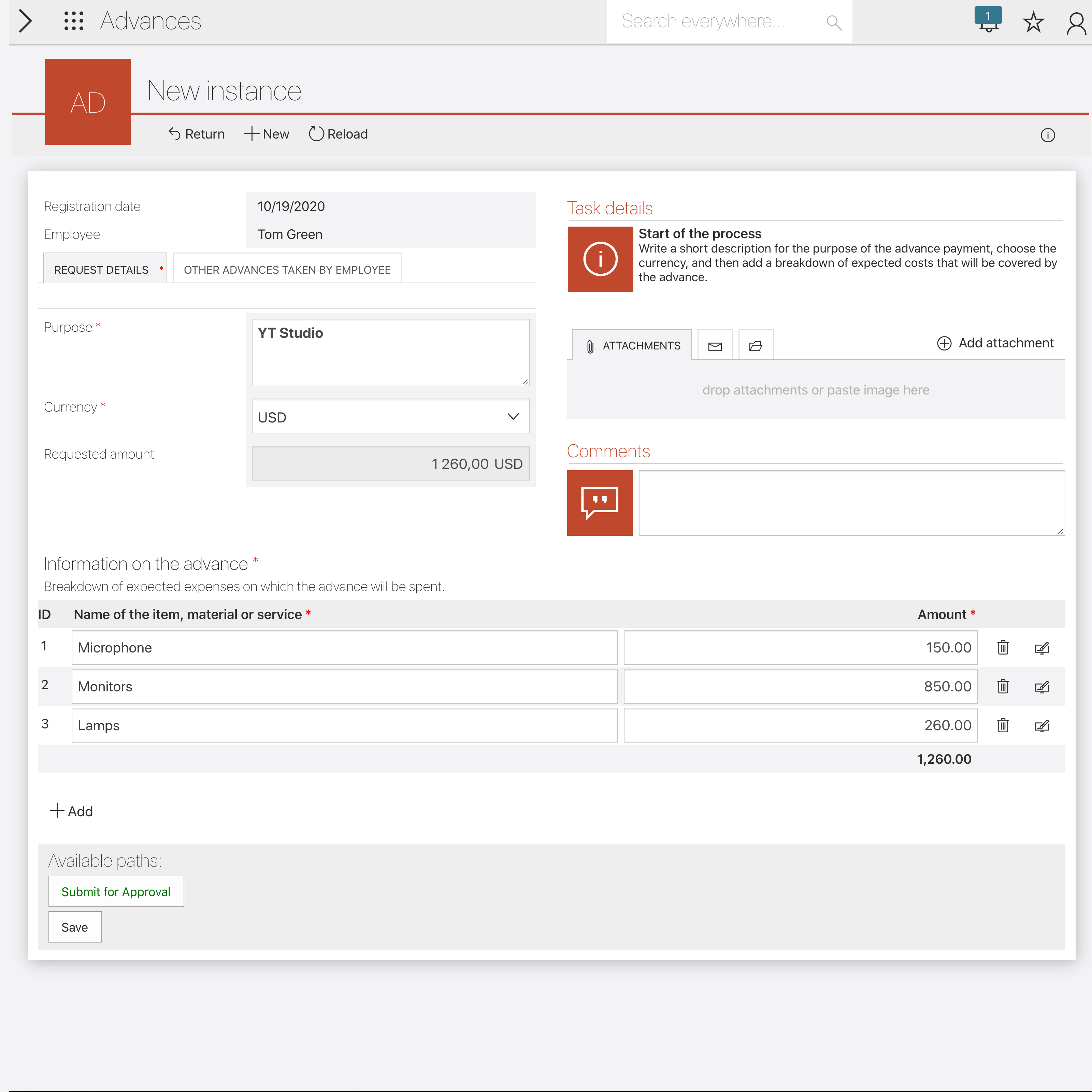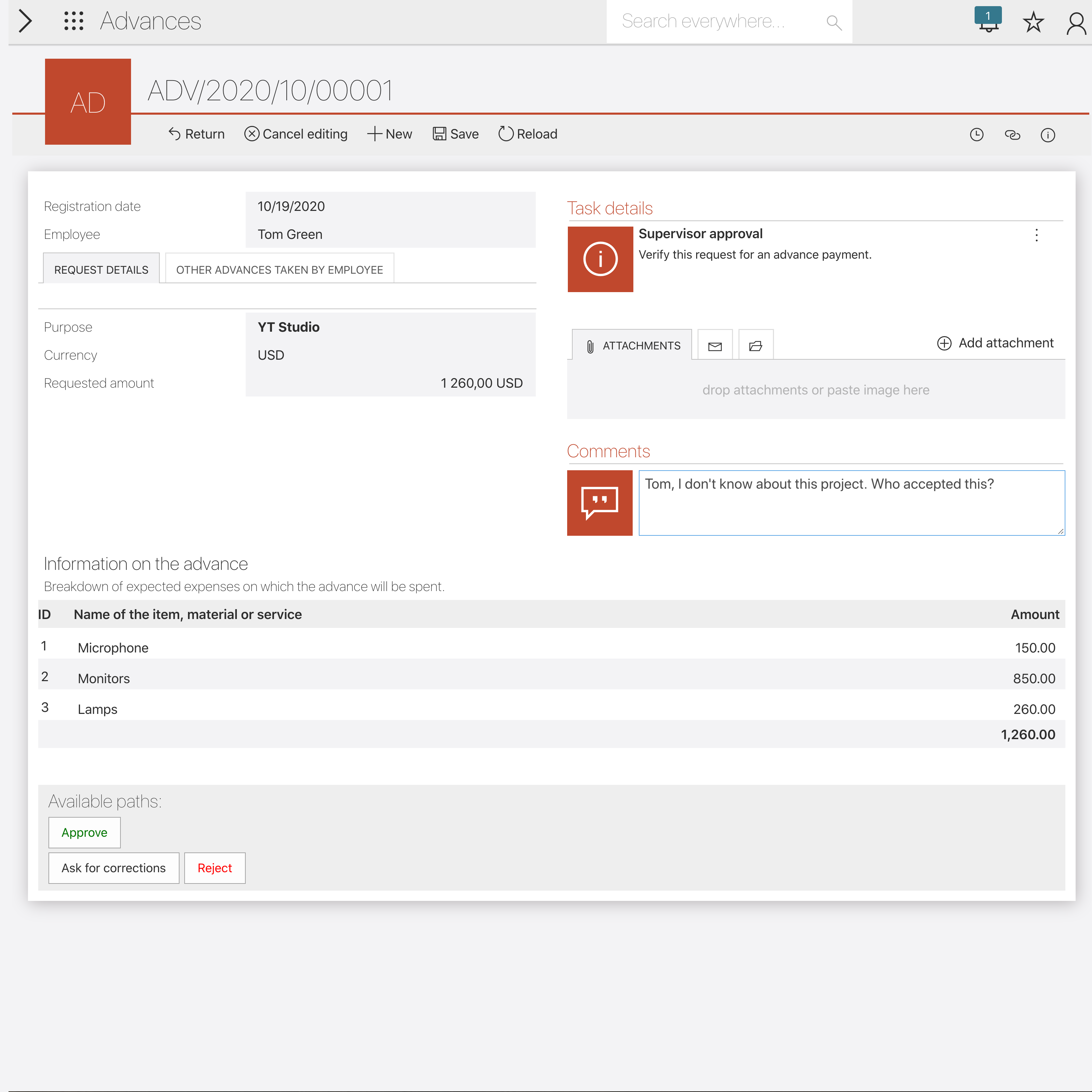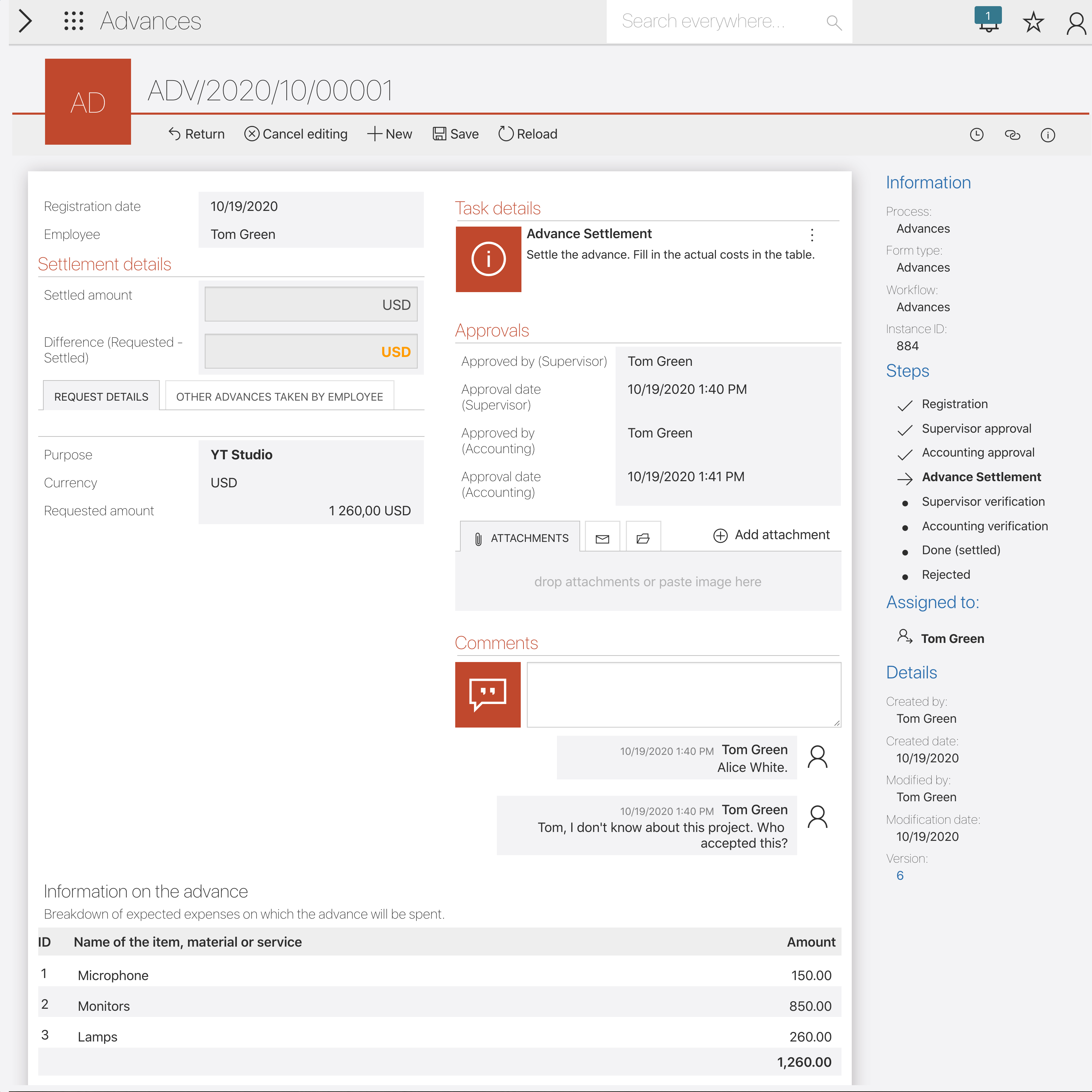 Employee – registers a request for an advance payment, and lists the expected expenses. Later on, they enter info about the actual costs they incurred [Settlement of the advance].