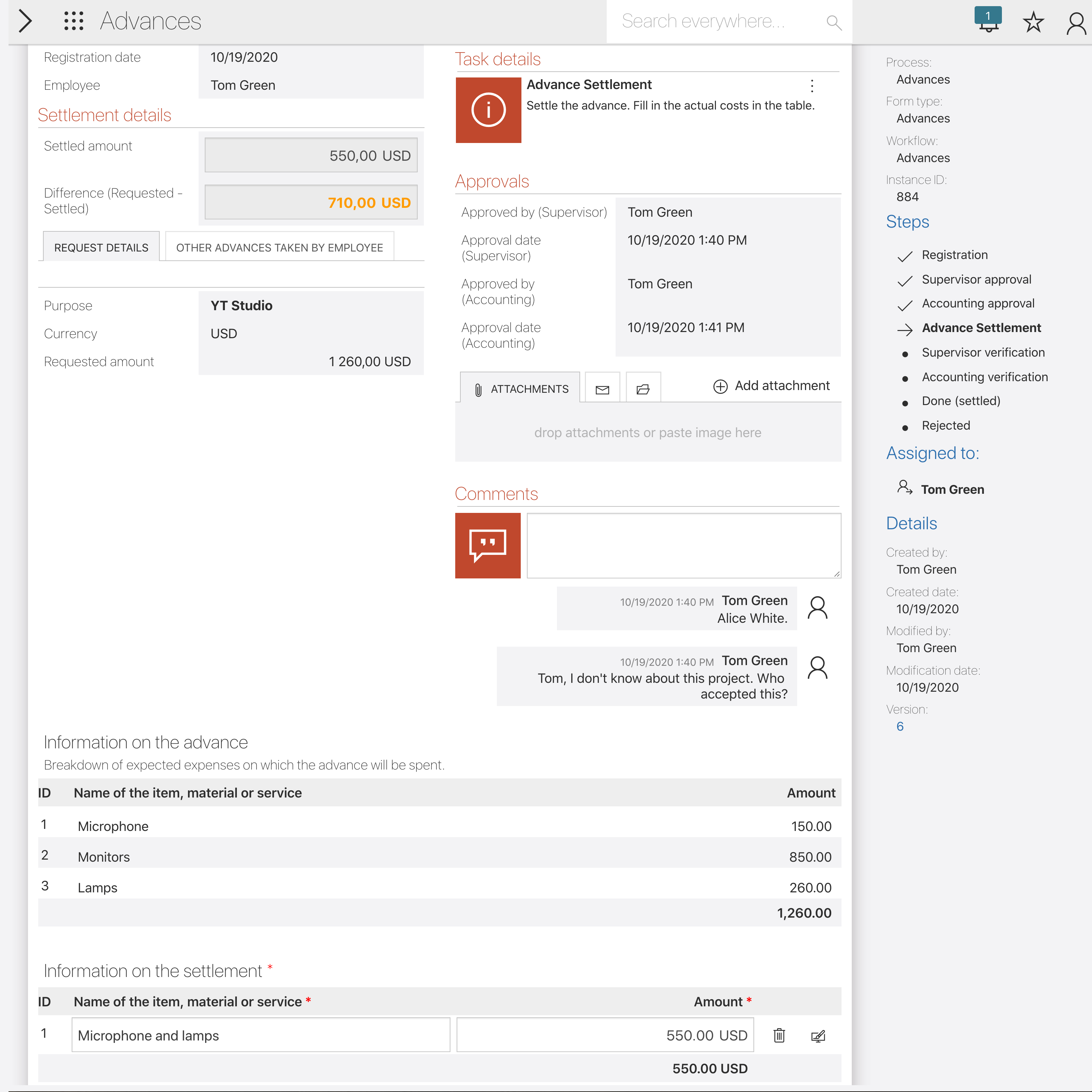 - [Settlement details]– Information about advances that are currently being settled (Accounting & Supervisor verification steps) or have already been settled [Done (Settled)].