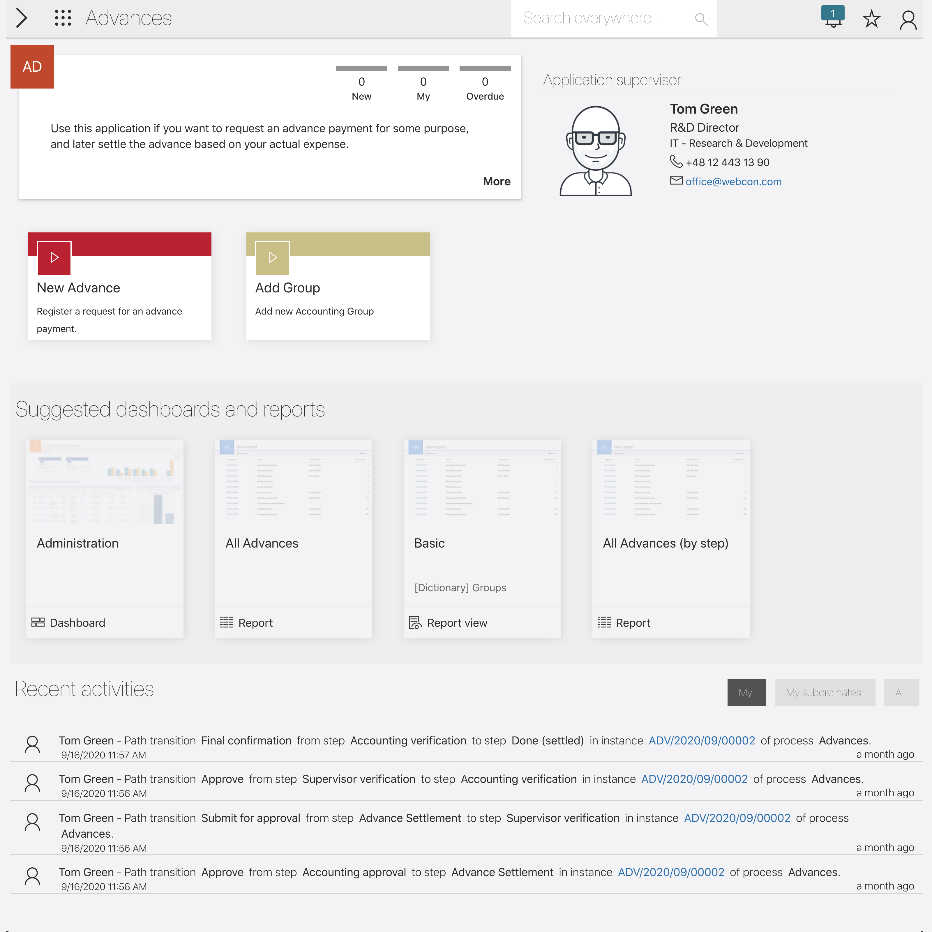 The Advances dashboard is as compilation of available system elements – buttons, reports, task counters (in the context of the current application). Feel free to modify this dashboard to fit your taste, you can even set it as the default page of the application.