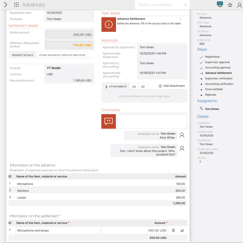 Accountant group – is a person or group of people, whos task is to approve the advance request, and later to verify the settlement of the payment. The accounting team is defined using a workflow in the dictionary process. The task is considered complete as long as one person of the group completes it.
