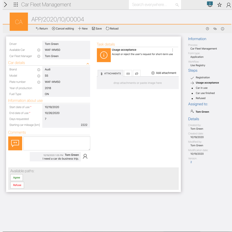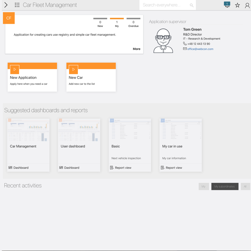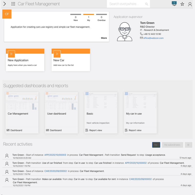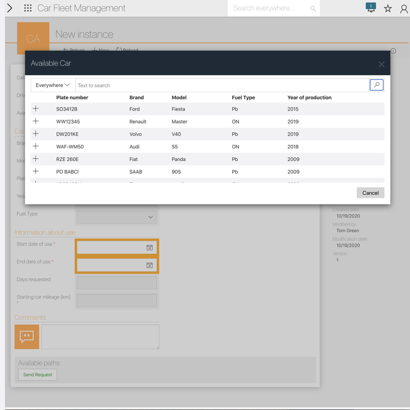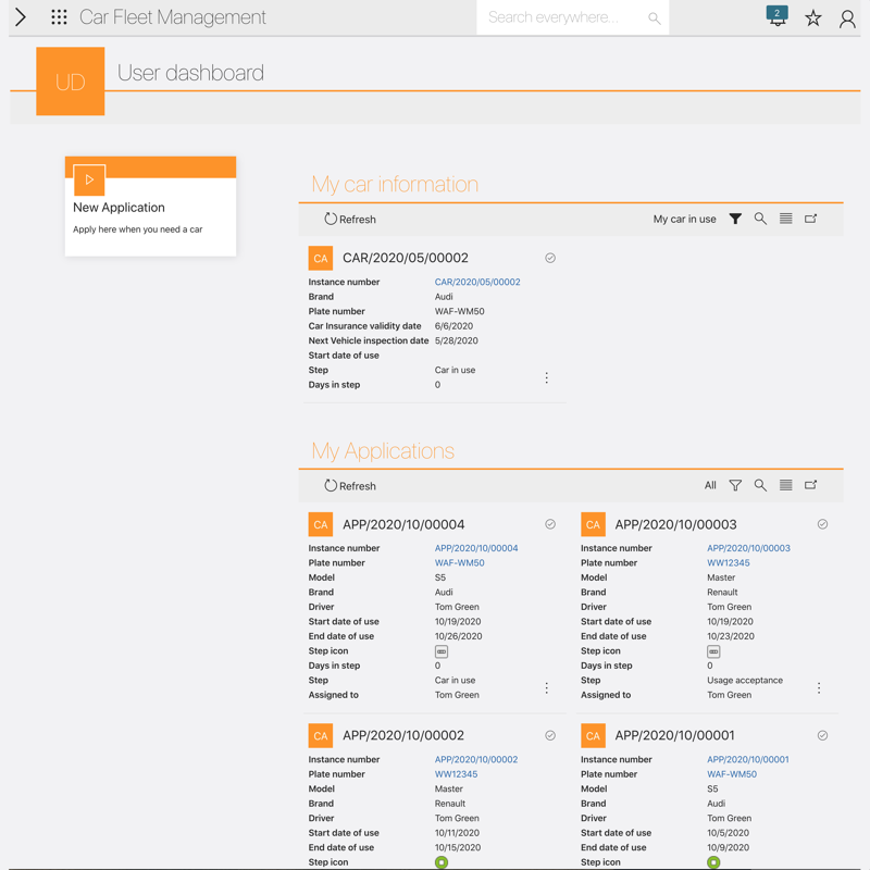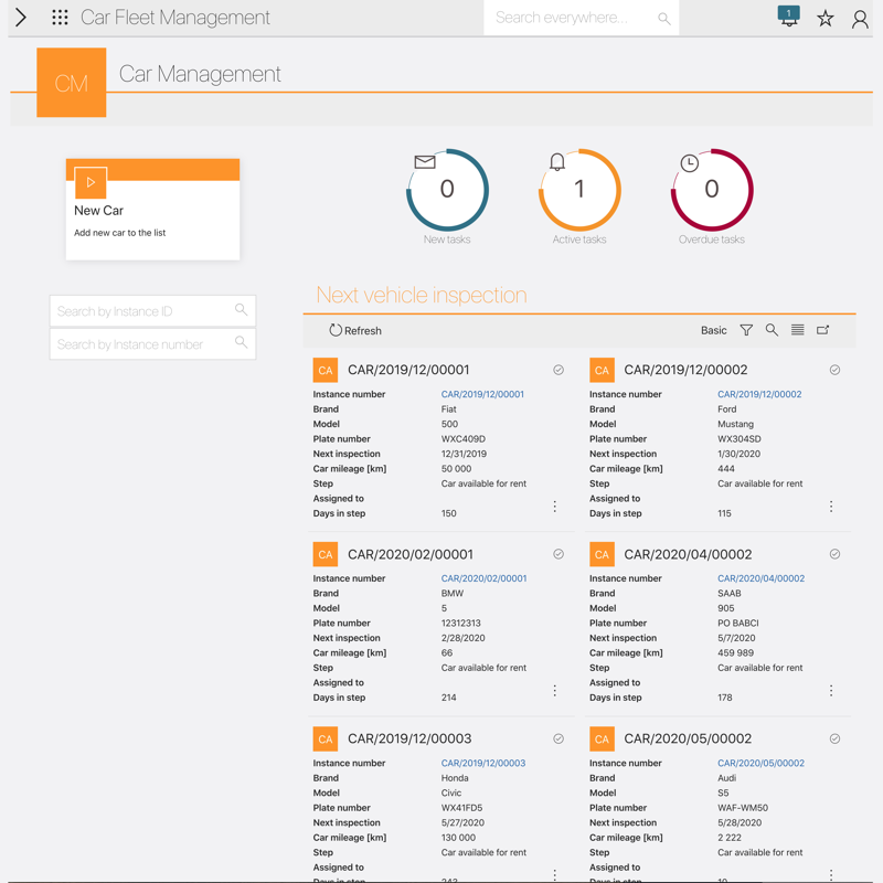 You can use the Car Fleet Management application to create a list of available cars in the organization and describe them with parameters. In addition, it contains the workflow used to manage the process of renting cars by employees.