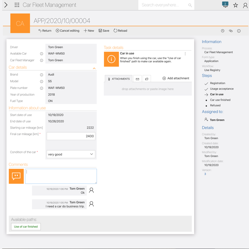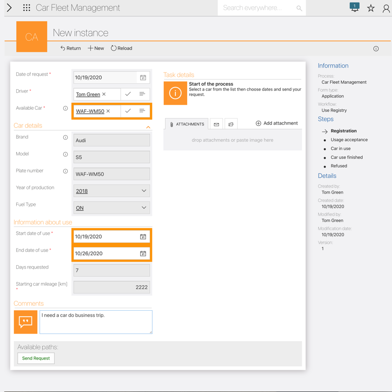 • Use Registry – this is the second process in the application used to request a car rental. An employee selects a vehicle from the list, specifies a start date of use, and then the responsible manager receives the task. After approval, the request moves to the “Car in use” step and is assigned to the author (the “Driver” field). To return the car, the employee uses the “Use of car finished” button.