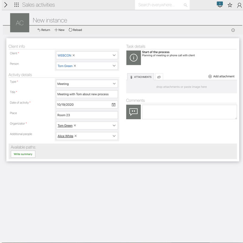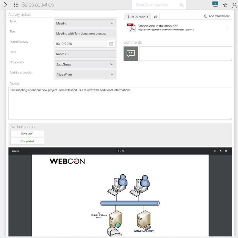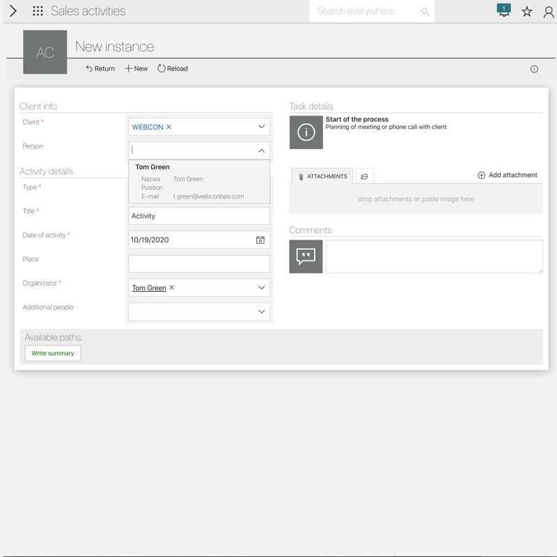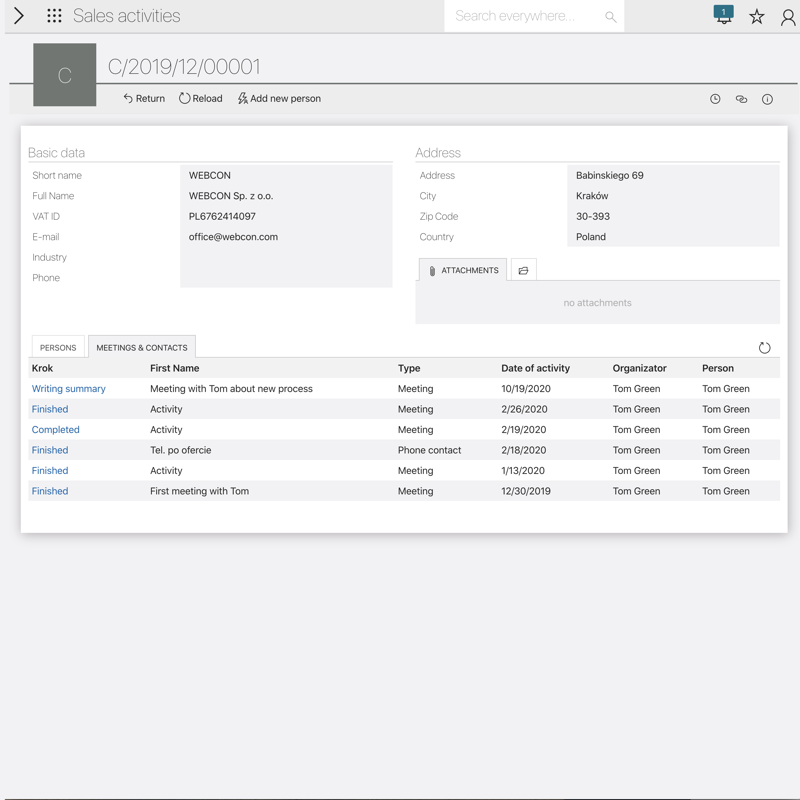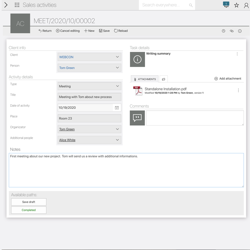 If the date of the activity is different than today, the system will register this activity as planned. On the activities list, the user can make notes from the meeting, canceled a planned meeting or change its date.