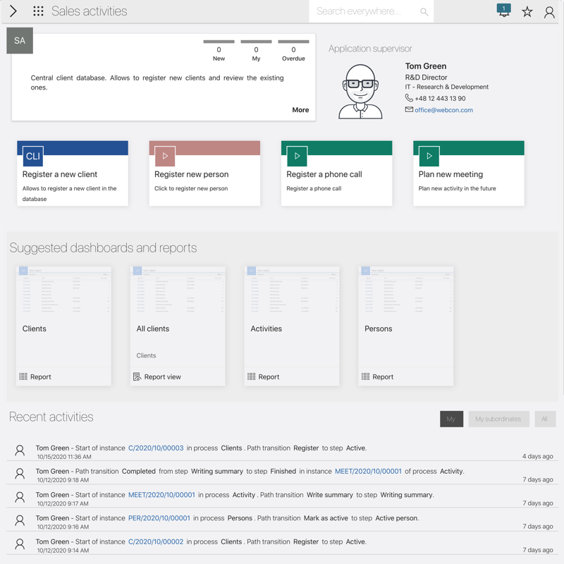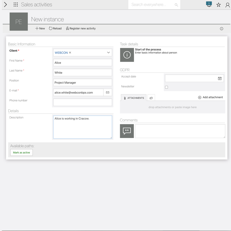 The saved client is in the Active step in the process. By entering its card you can quickly check recent activity, contact persons, notes or attachments.
