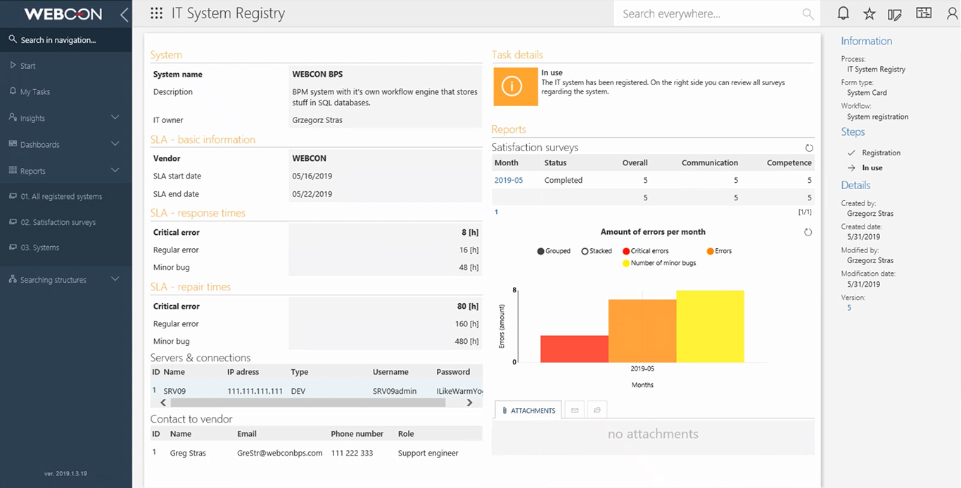 - System details in one place: owner, vendor, servers used, important contacts