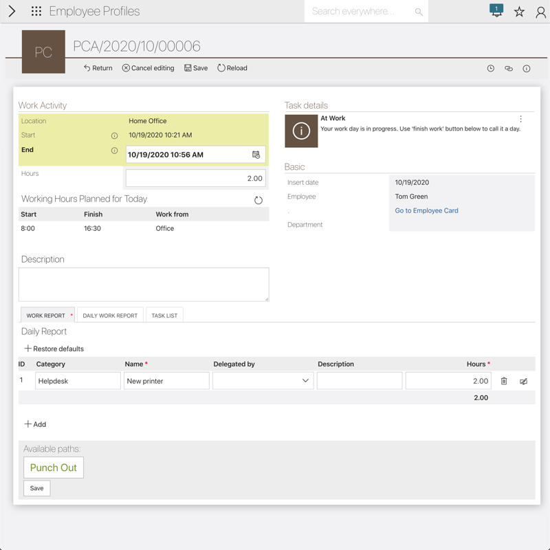 The Time clock application is designed to help managers and employees alike. Punch in, choose the task you are working on (or create it), and that's it! When you finish your workday, punch out, and the application will document how long you have been working on a given task. It will come in handy at the evaluation!